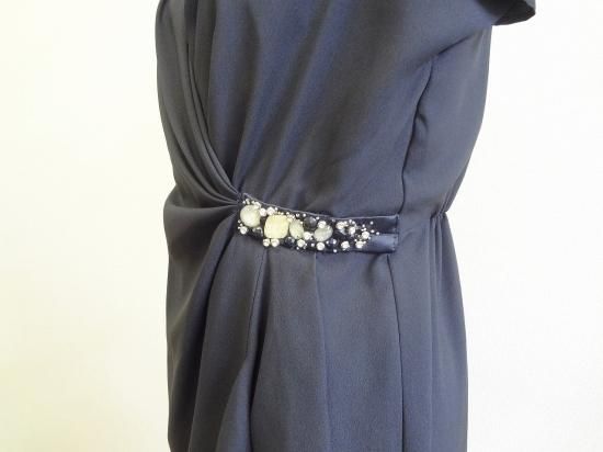 ・前身左脇ビジューモチーフ縫い付け、ドレープ留め