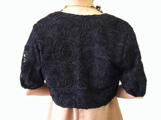 花柄テープ刺繍の上にビーズがライン上に施された、大人な雰囲気のボレロです。