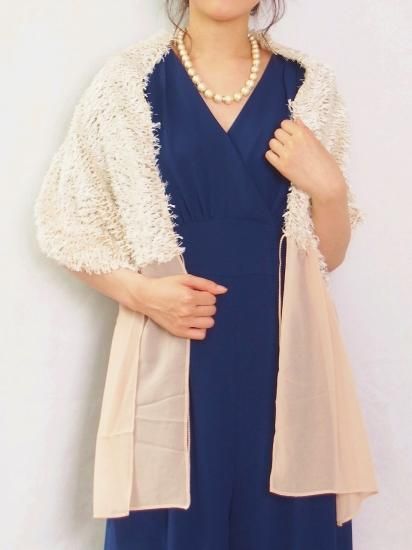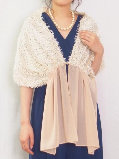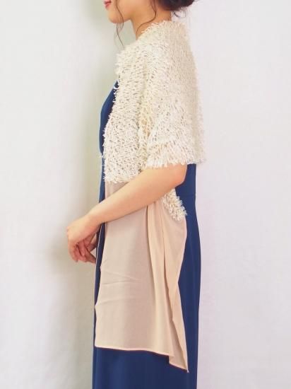 毛足を長くカットしシャギーのようにみせたカットジャガード生地をメインに使用したストールです。軽く肩にかけて、前で結んで、後ろで結びボレロ風に、と様々なアレンジが可能です。