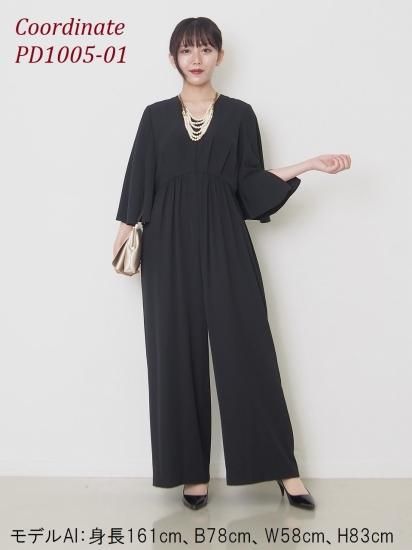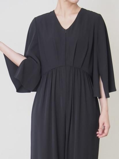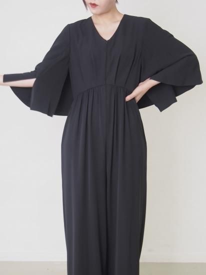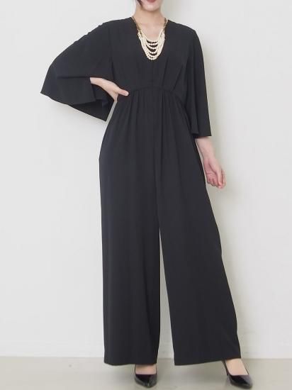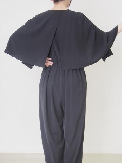 ケープスリーブ、ワイドパンツのデザインが、モードな雰囲気を醸し出すオールインワンパンツドレス。