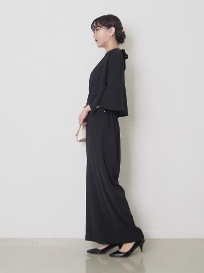 動きに余韻を残すワイドパンツが、脚捌きを美しく見せるだけでなく、すらりとした脚長効果を実現する仕様になっています。